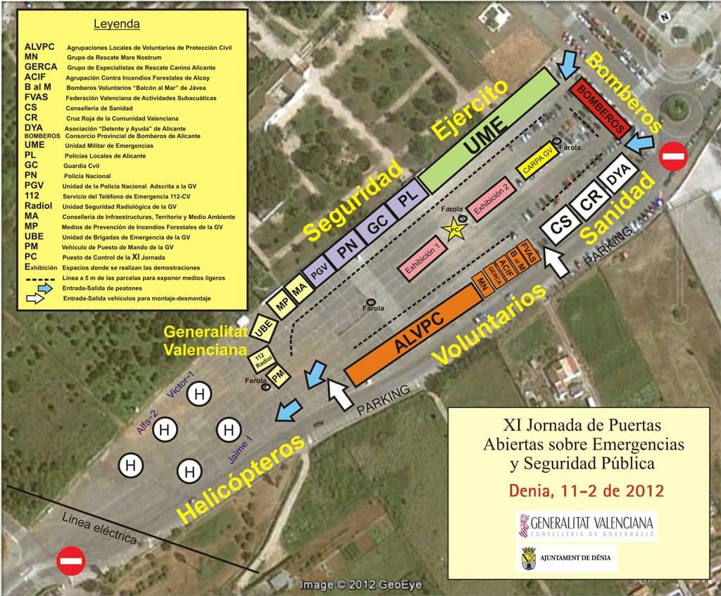 Desde las 10 de la mañana se instalarán 21 stands informativos de las entidades que colaboran: agrupaciones locales de voluntarios de Protección Civil; Grupo de Rescate Mare Nostrum; Grupo de Especialistas de Rescate Canino de Alicante; Agrupación contra incendios forestales de Alcoi; Bomberos Voluntarios “Balcón al Mar” de Xàbia; Federación Valenciana de Actividades Subacuáticas; Conselleria de Sanidad; Cruz Roja Comunidad Valenciana; Asociación “Detente y Ayuda” de Alicante; Consorcio Provincial de Bomberos de Alicante; Unidad Militar de Emergencias (UME) de Alicante; Policía Local; Guardia Civil; Policía Nacional; Unidad de Policía Nacional adscrita a la Generalitat Valenciana; Servicio del Teléfono de Emergencia 112; Unidad de Seguridad Radiológica de la Generalitat Valenciana; Conselleria de Infraestructuras, Territorio y Medio Ambiente; Medios de Prevención de Incendios Forestales de la Generalitat Valenciana y la Unidad de Brigadas de Emergencia de la Generalitat.