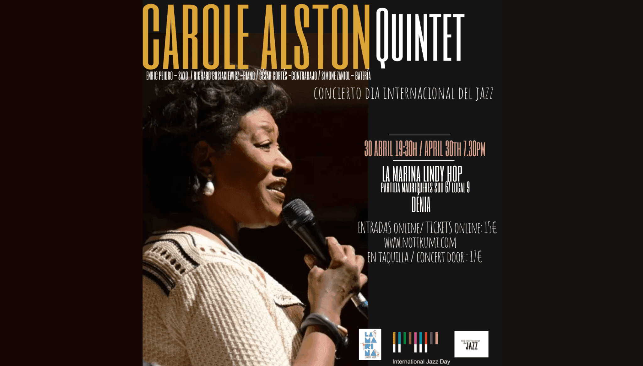 25 de abril de 2023 - 16:48 Foto Anterior3 de 3Ver el artículo original: Llega a Dénia la fresca y creativa música de jazz con el concierto de Carole Alston Actuación de Carole Alston en las instalaciones de La Marina Lindy Hop Carole Alston viajará a Dénia para actuar Carole Alston Quintet