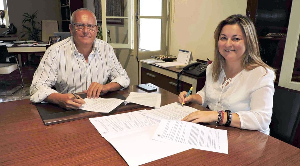 El alcalde de Dénia, Vicnet Grimalt, y la directora del centro asociado de la UNED en Dénia, Raquel Martí, en la firma del acuerdo de cooperación educativa.