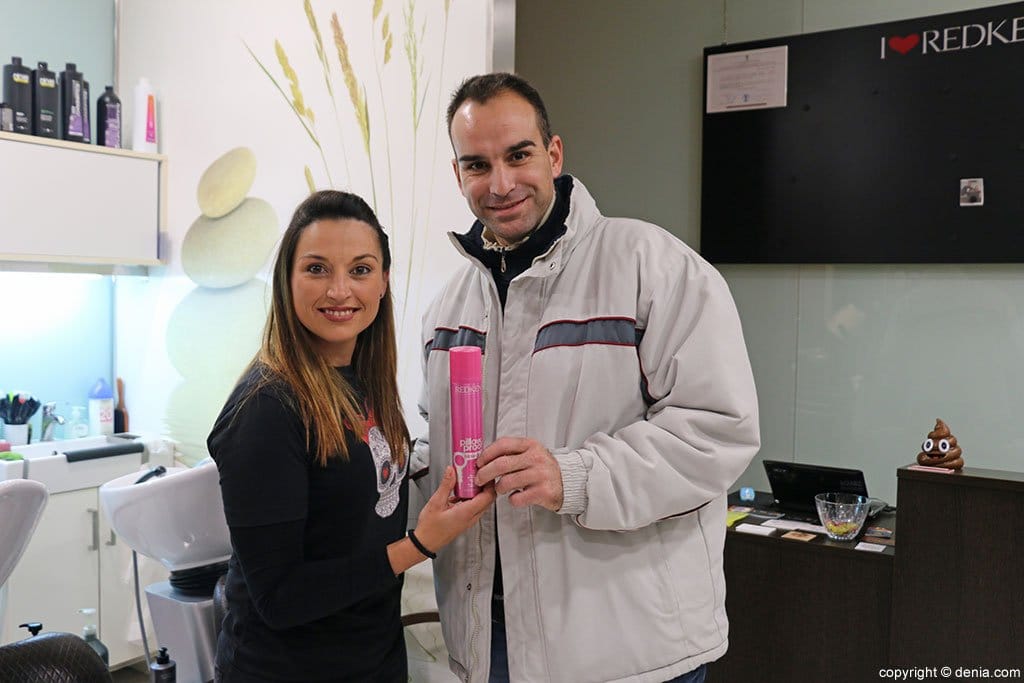 Vicente, el ganador de la cesta de navidad, recogiendo su premio en Toni Devesa Estilistes.