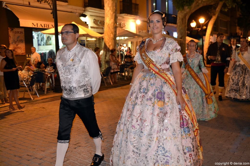 Representantes de las poblaciones invitadas a la presentación de las falleras mayores de Dénia durante el pasacalle.