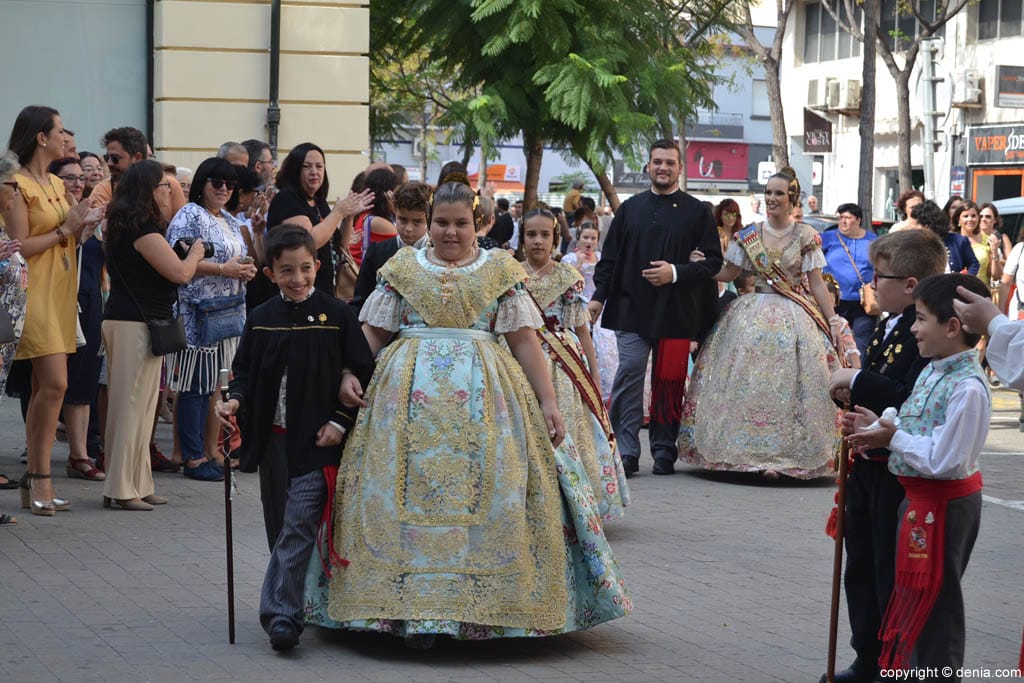 Llegada de la comisión infantil de la falla Centro al Centro Social de Dénia, donde se celebró la presentación de Lucía Signes como fallera mayor infantil.