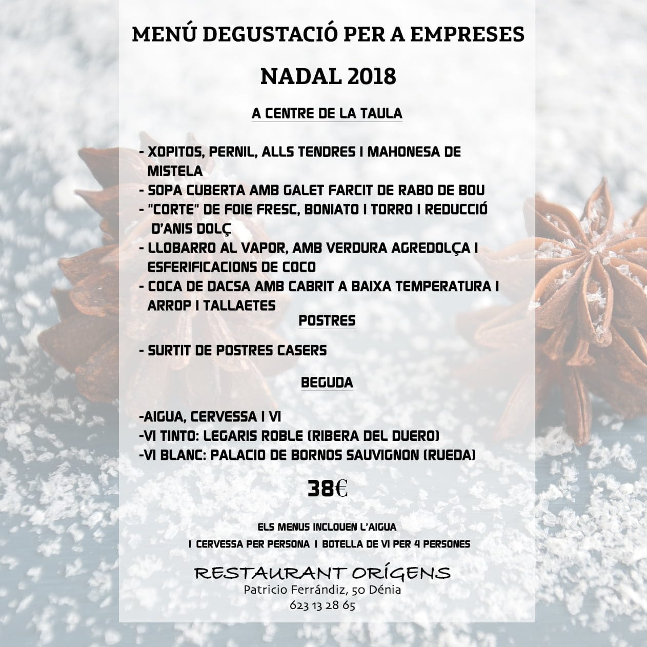09 de noviembre de 2018 - 10:12¡Reserva ya tu mesa! 1 de 4Foto SiguienteVer el artículo original: Menús de empresa Navidad 2018 Restaurant Orígens Menu de nadal empreses DE GUSTACIO RESTAURANT ORIGENS Menu de nadal empreses RESTAURANT ORIGENS Sala de Restaurant Orígens Restaurant Orígens