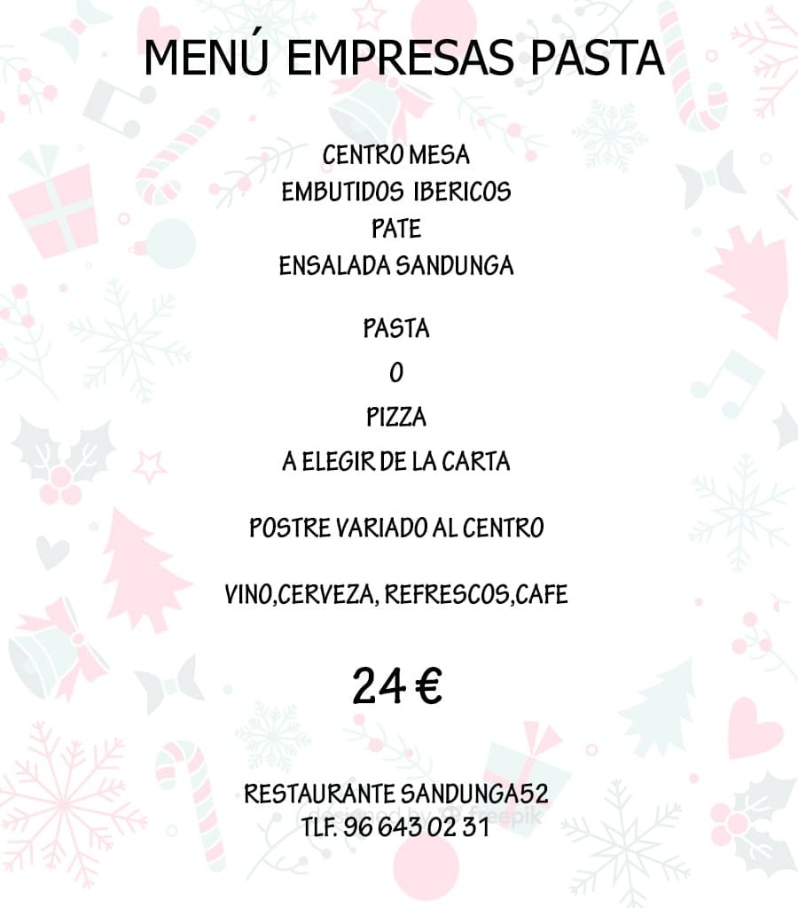 15 de noviembre de 2018 - 11:41Ideal para los amantes de la pizza o pasta. Foto Anterior3 de 7Foto SiguienteVer el artículo original: Menús de empresa Navidad 2018 Sandunga 52 Menú empresas Carne Menú empresas PICADAS Menú empresas Sangunga Pasta Menú Nochevieja 2018 Restaurante Sandunga Menú Navidad 2018 Restaurante Sandunga Sandunga 52 Mesa interior Sandunga 52