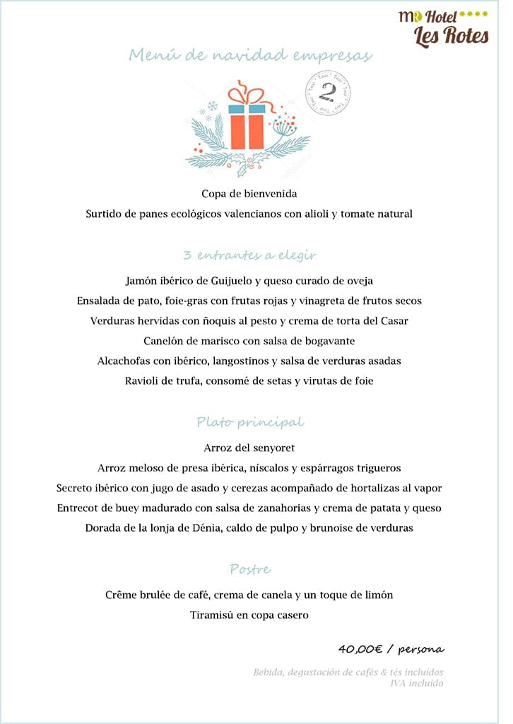 22 de noviembre de 2017 - 11:21¡Reserva ya tu mesa! Foto Anterior2 de 5Foto SiguienteVer el artículo original: Menús para empresas 2017 en Hotel Les Rotes Menú de Navidad empresas n1 Hotel Les Rotes Menú de Navidad empresas n2 Hotel Les Rotes Menú de Navidad empresas n3 Hotel Les Rotes Salón de celebraciones Hotel les Rotes Hotel les rotes