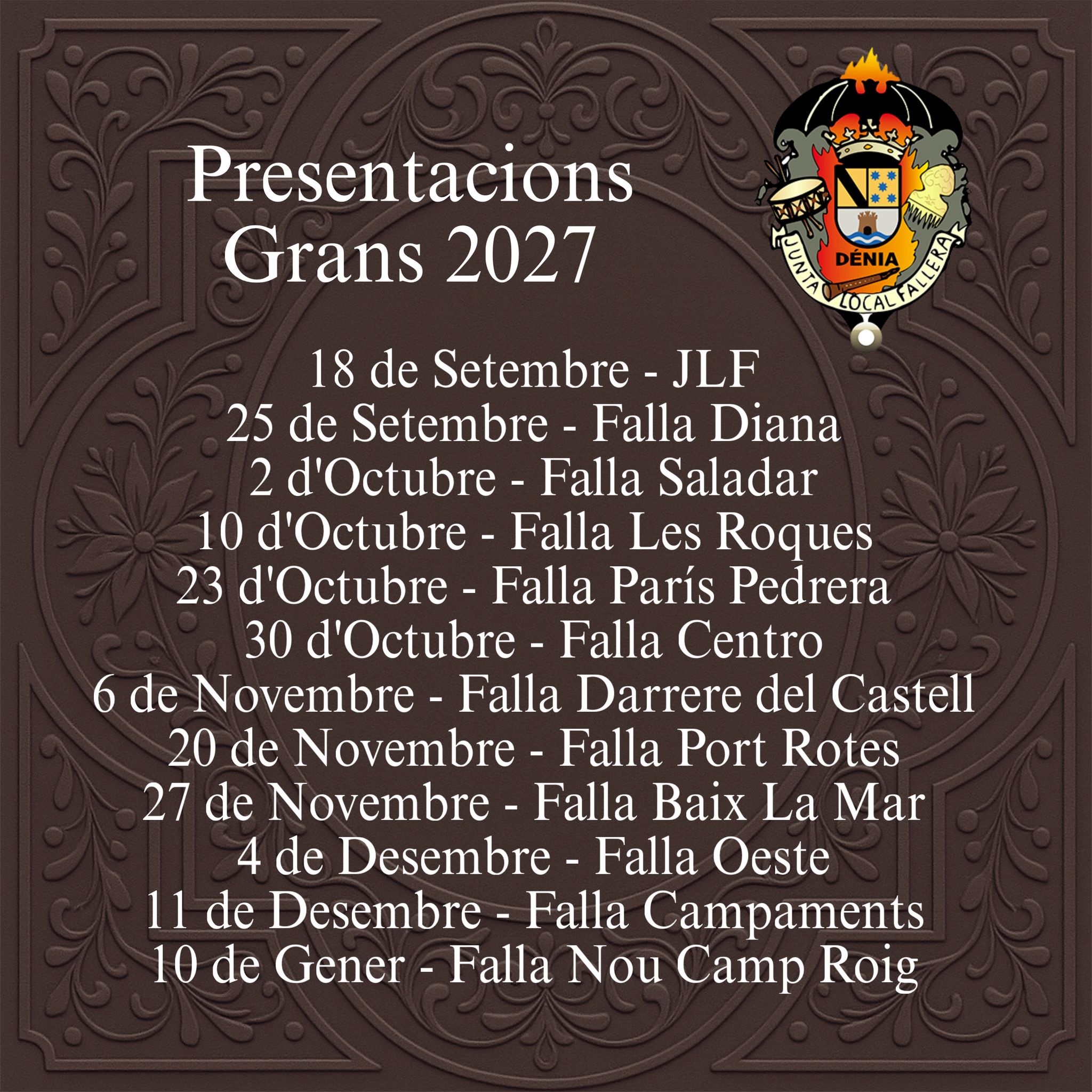 28 de abril de 2026 - 10:06 Foto Anterior3 de 5Foto SiguienteVer el artículo original: Mira cuándo es tu presentación: Dénia desvela el calendario fallero 2026-2027 Presentación de Paula Argudo, Fallera Mayor de Dénia 2026 Desfile de carrozas de Dénia de 2025 Presentaciones grandes Fallas de Dénia 2026-2027 Presentaciones Fallas infantiles Dénia 2026-2027 Orden carrozas Dénia 2026