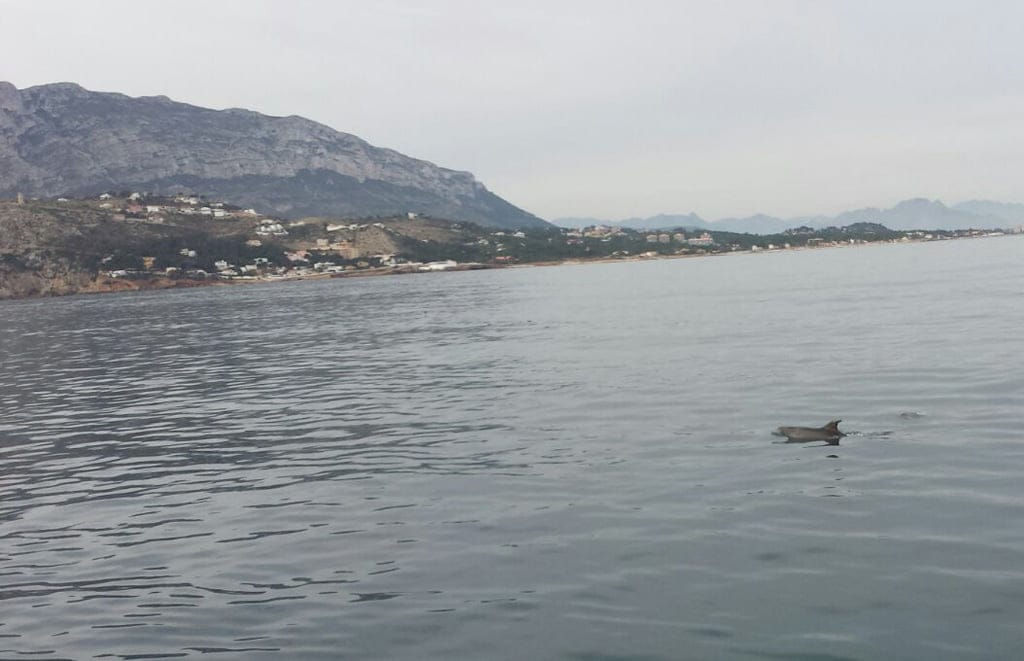 Imágenes tomadas desde el barco de la Reserva Marina del Cabo de San Antonio, con varios delfines nadando a su alrededor.