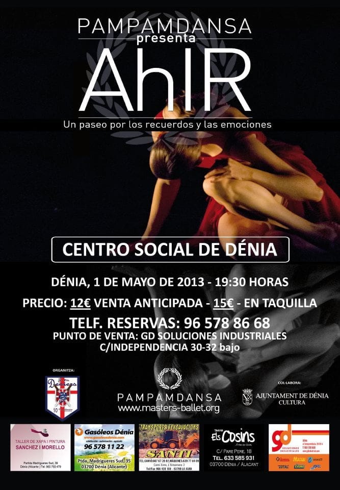 “Ahir” será una muestra de danza contemporánea que se representará en el Teatro Auditorio del Centro Social a las 19:30 horas. Las entradas se pueden adquirir en las taquillas del auditorio por 15 euros, y de manera anticipada, llamando al 96 578 86 68, por 12 euros.