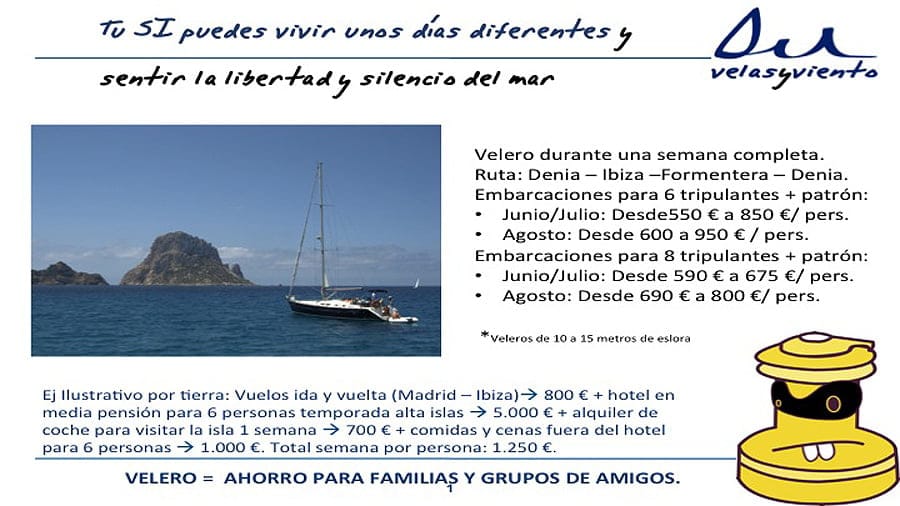 Una semana completa con un velero de 10 a 15 metros de eslora, con capacidad para 6 tripulantes más un patrón, con ruta Dénia-Ibiza-Formentera-Dénia, Junio/Julio desde 550 € a 850 € por persona y agosto desde 600 € a 950 € por persona.