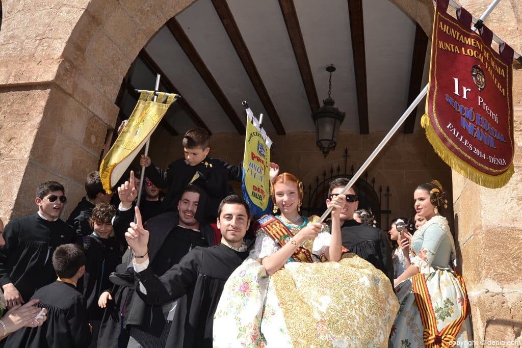 Los falleros de la falla centro aúpan a los cargos infantiles 2014, adela Chornet y Javier Serra, con el banderín de primer premio de sección especial de las fallas infantiles de Dénia 2014.
