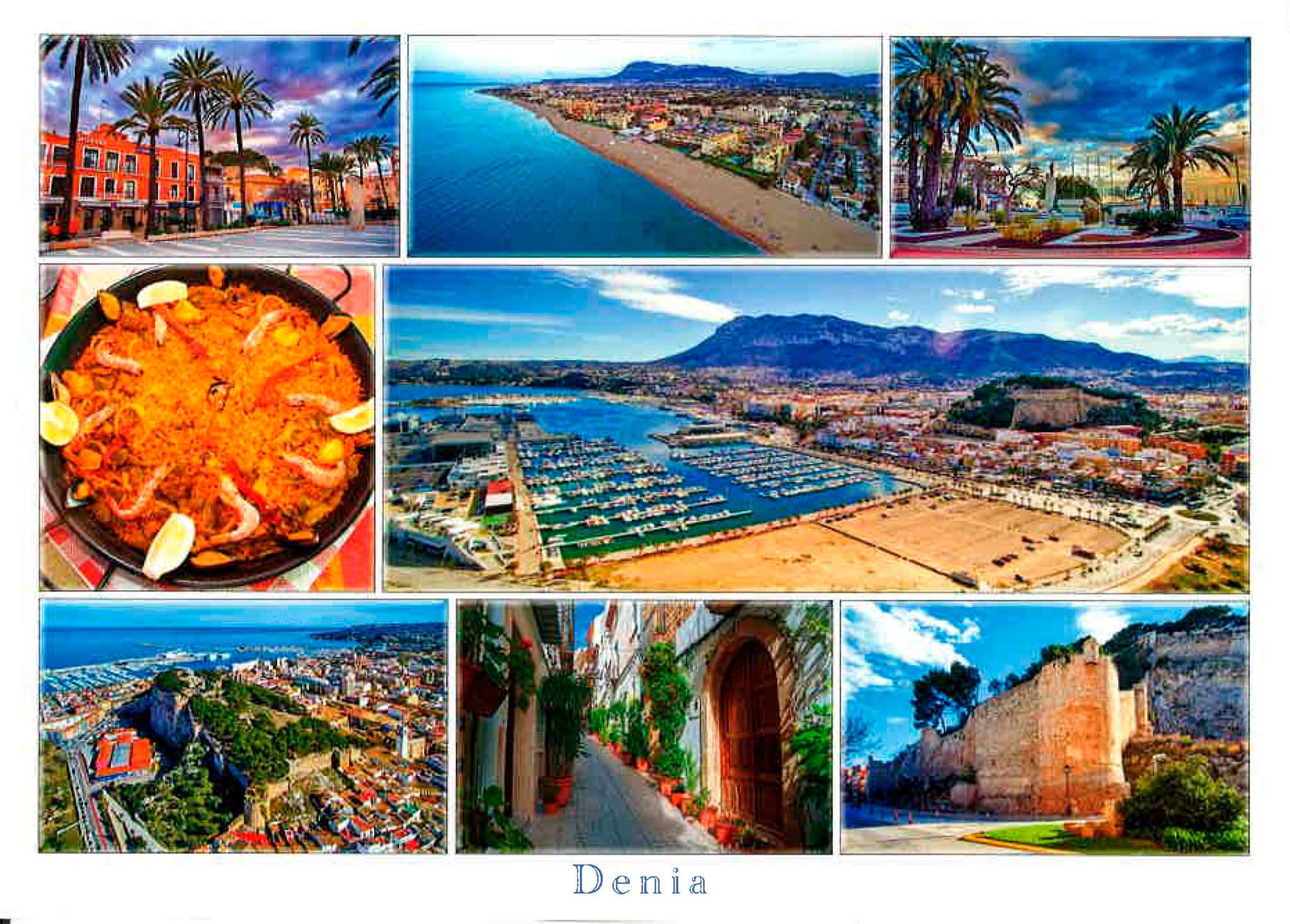 Postal de Dénia con una paella, el puerto, Les Marines, el Castillo y una calle de Xàbia