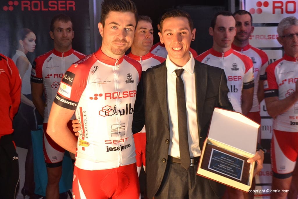 El profesional de Jávea que milita en el Caja Rural recibiendo la placa de agradecimiento por su estancia en la presentación.