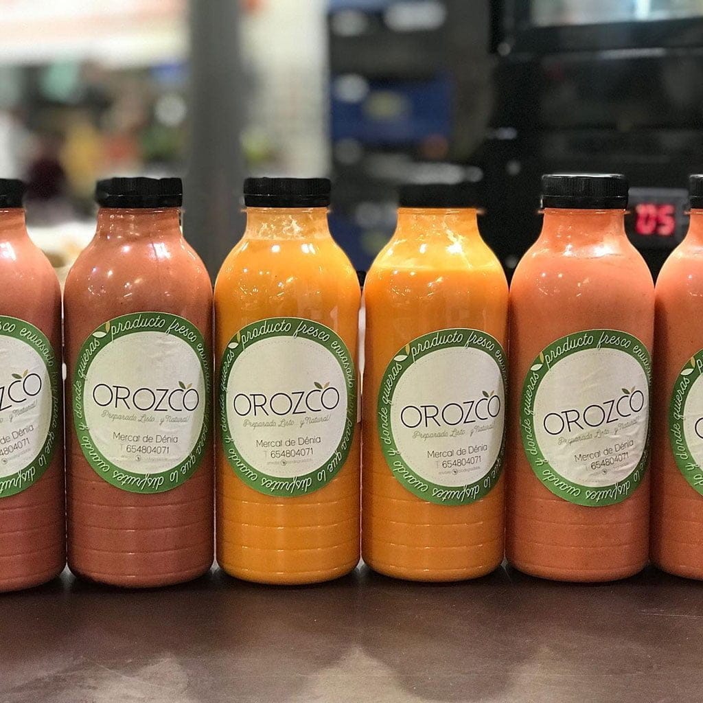 Gazpachos de fresa, de remolacha, de melocotón y también tradicional en el puesto del Mercat Municipal de Dénia de Frutas y verduras Orozco