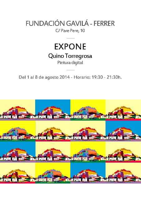 29 de julio de 2014 - 09:22El artista Quino Torregrosa expone su obra de pintura digital en la Fundació Gavilà Ferrer. 1 de 2Foto SiguienteVer el artículo original: Quino Torregrosa expone en la Fundació Gavilà Ferrer Exposición de Quino Torregrosa Quino Torregrosa