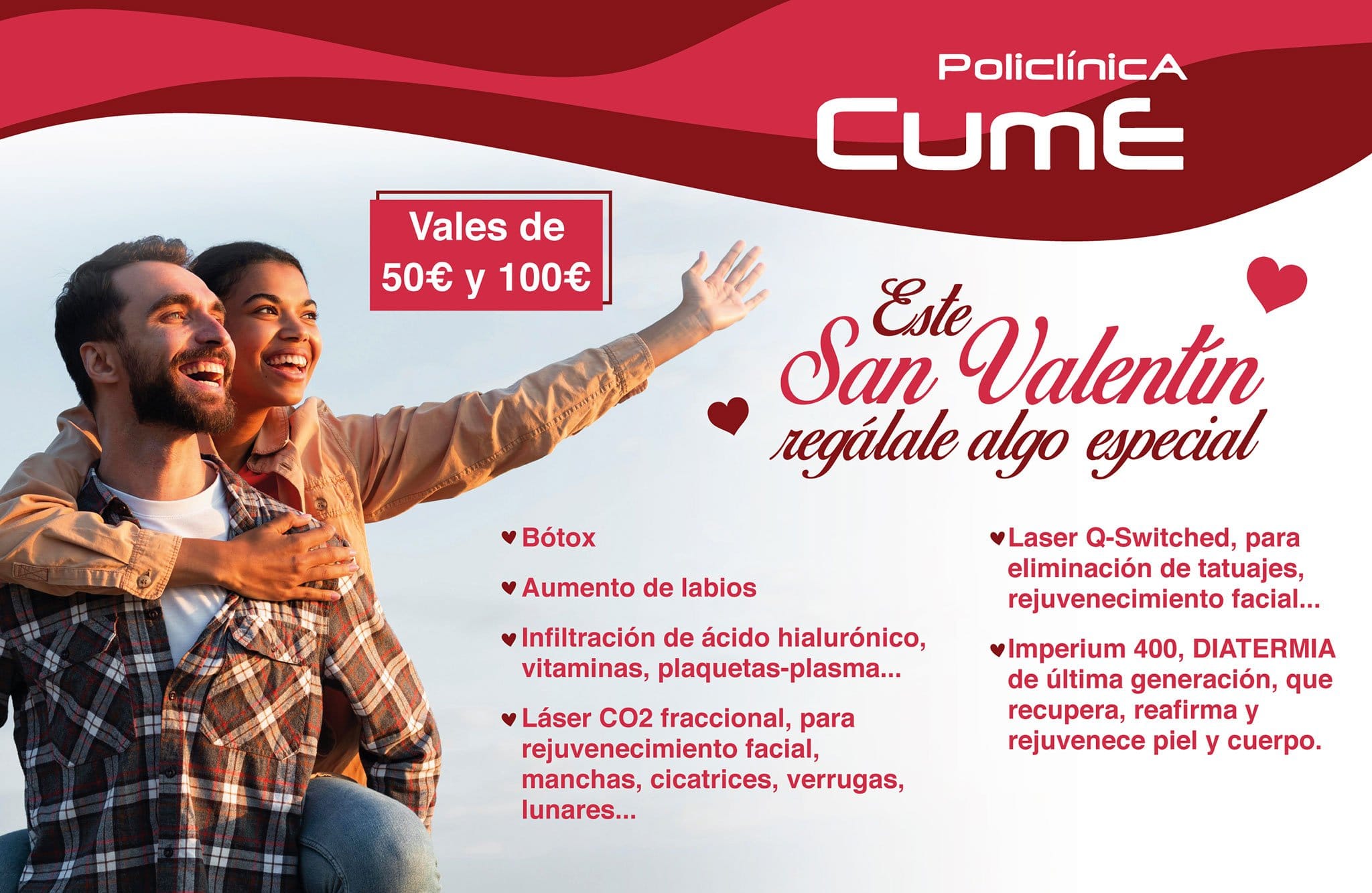 05 de febrero de 2021 - 09:07Vales de 50€ y de 100€. Foto Anterior2 de 2Ver el artículo original: Regala un vale de 50€ o 100€ para San Valentín con Policlínica CUME Logotipo de Policlínica CUME Vales regalo para San Valentín – Policlínica CUME