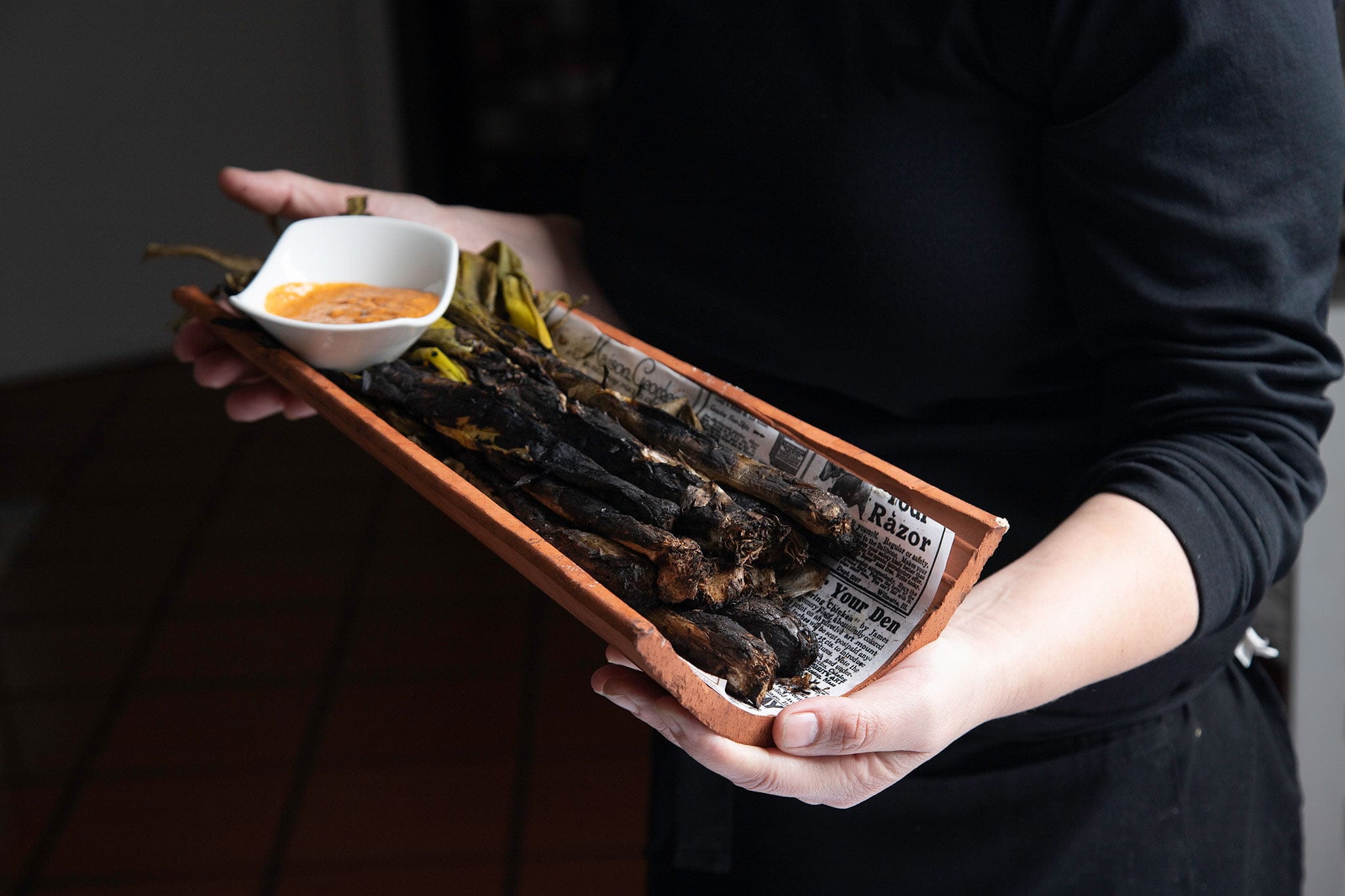 Menú con todos los elementos típicos de una calçotada tradicional, como la salsa romescu, pan payés y babero para no mancharte