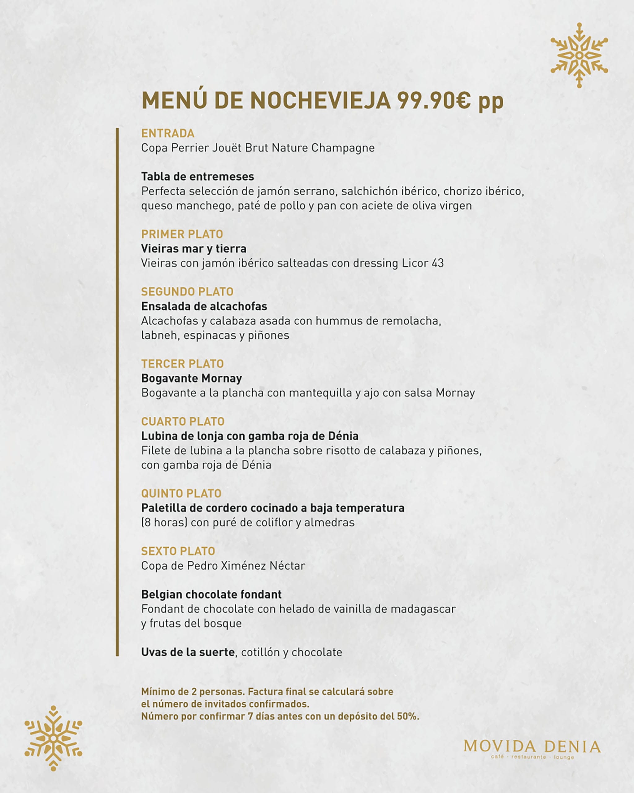11 de noviembre de 2021 - 15:49 1 de 3Foto SiguienteVer el artículo original: Reserva ya tu menú de Navidad y Nochevieja en el ambiente más sofisticado de Movida Dénia Menú de Nochevieja en Movida Dénia Menú de Navidad en Movida Dénia Ambiente relajado y sofisticado en Movida Dénia