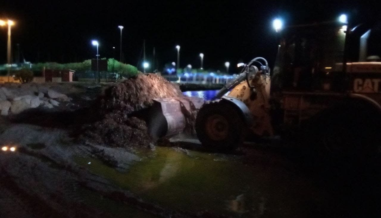 10 de agosto de 2021 - 11:41 1 de 1Ver el artículo original: Retiran 260 toneladas de posidonia tras el temporal del domingo Retirada de posidonia en la Marineta Cassiana