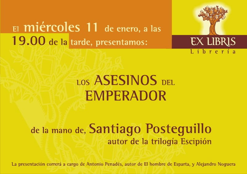 La librería Exlibris trae a Dénia a Santiago Posteguillo, que presentará su último libro, “Los Asesinos del Emperador”. La obra narra la historia de Trajano, el primer emperador hispano de la historia y será presentada por el arqueólogo, historiador y viajero, director del L’Iber -museo de los soldaditos de plomo- de Valencia Alejandro Noguera y Antonio Penades, autor de “El hombre de Esparta”.