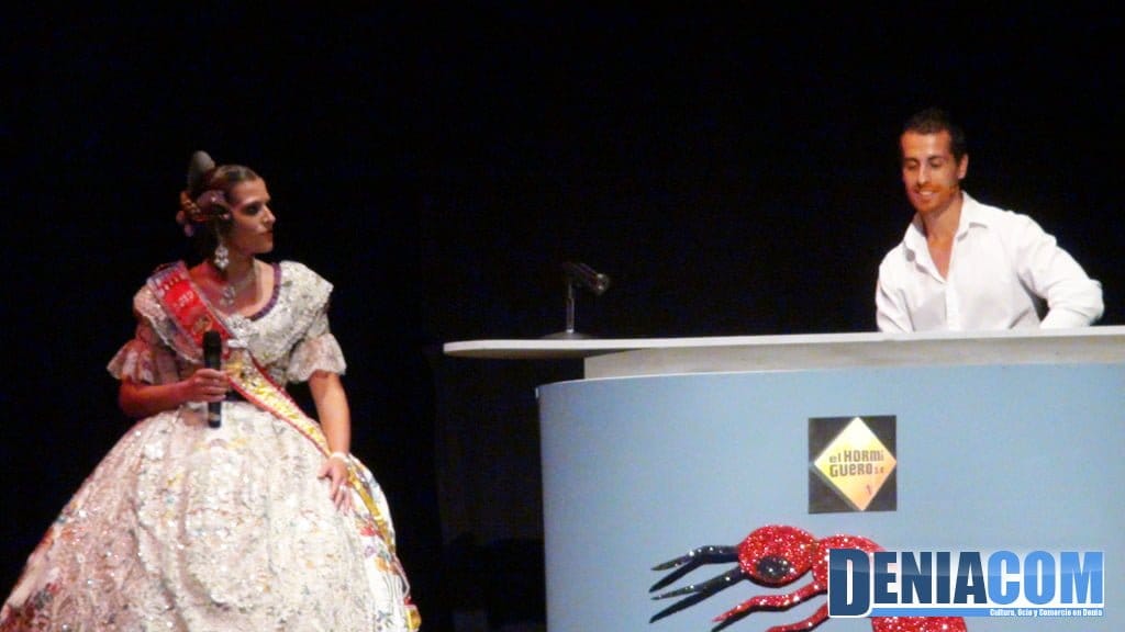 Imágenes de Sara acompañaron su entrada, que fue muy aplaudida por el auditorio. Tras recibir la banda que le acredita como Fallera Mayor de su comisión, Sara fue entrevistada y puesta a prueba: es peluquera y le tocó peinar al presentador como a una fallera más.