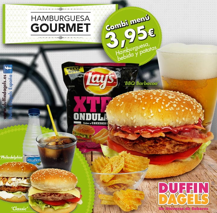Y, en la carta del salado, …¡hamburguesas gourmet! Mmmm… Acude de 13 a 16 horas a Duffin Dagels Dénia y degusta cualquiera de las 3 hamburguesas disponibles por sólo 3,30 € (3,95 € si vas fuera de horario).