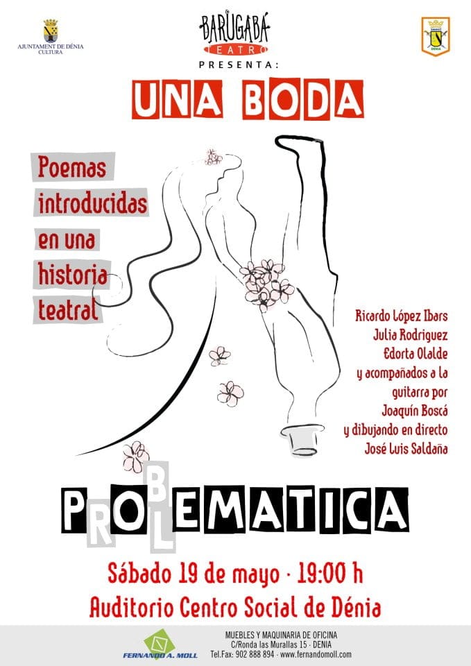 Barugabà Teatro presenta la obra “Una boda problemàtica”. Será un recital de teatro poético que tendrá lugar el sábado 19 de mayo a las 19 horas. Las entradas se pueden adquirir por 10 € el mismo día de la representación desde una hora antes en las taquillas del Centro Social de Dénia.