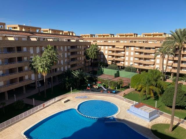 Piscina rodeada de amplias zonas ajardinadas y un cuidado mantenimiento