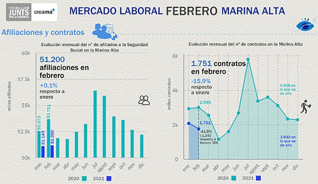 12 de marzo de 2021 - 14:26 Foto Anterior2 de 2Ver el artículo original: Un mal febrero en la Marina Alta eleva el paro por encima de los 14.800 y aumenta hasta los 3.761 los ERTE Desempleo en febrero en la Marina Alta Mercado laboral de febrero en la Marina Alta