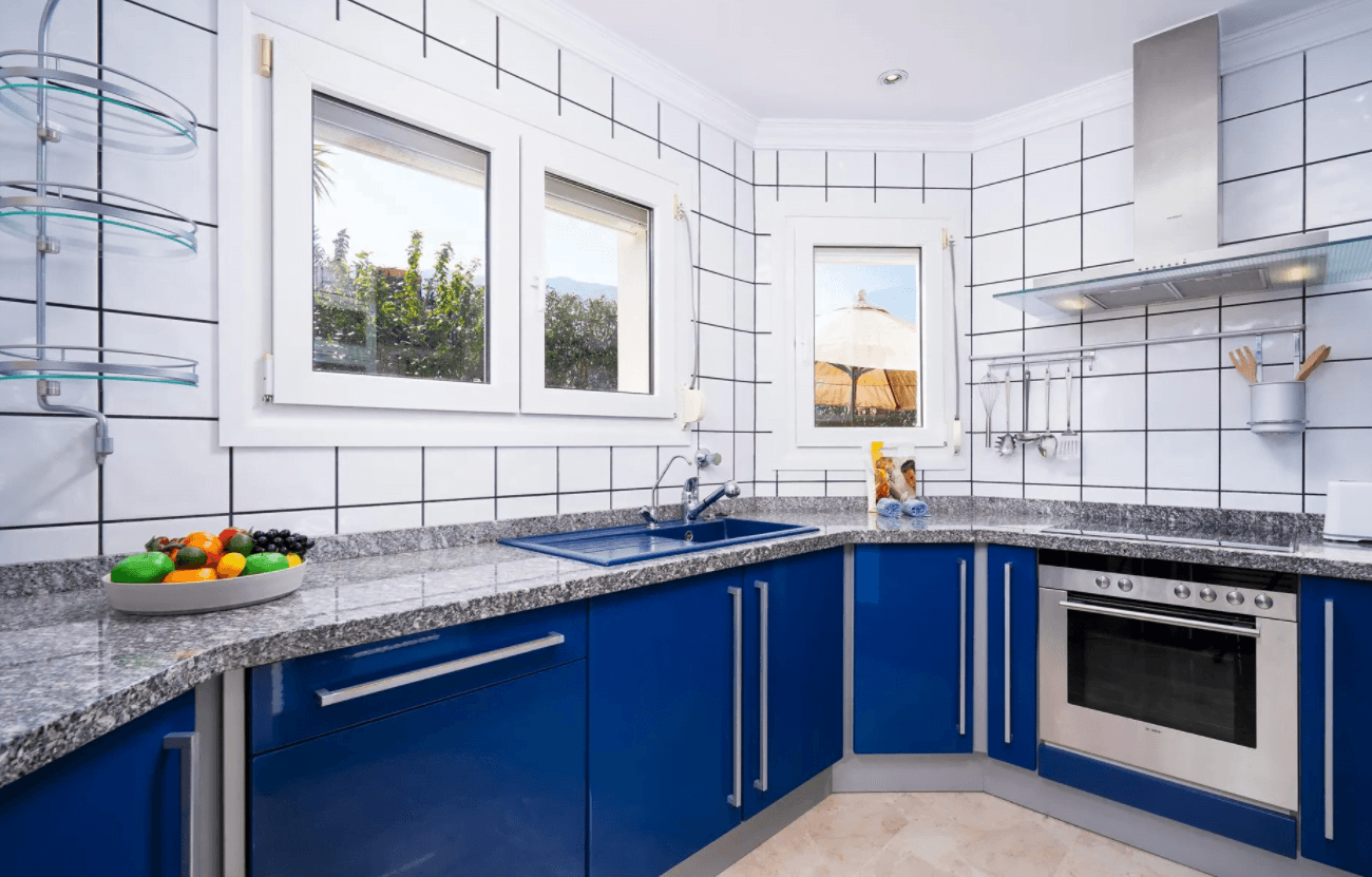 Su cocina en colores azul marino y blancos, nos recuerda al estilo mediterráneo que adopta la casa. Está completamente equipada con lavavajillas, horno eléctrico y tostadora, entre otros electrodomésticos.
