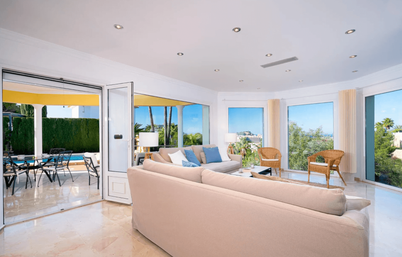 Amplio salón muy luminoso, con cristaleras que nos ofrecen preciosas vistas al puerto de Dénia y a la montaña. Está decorado con dos sofás en color arena y sillas de mimbre, además tendrás acceso directo al jardín.