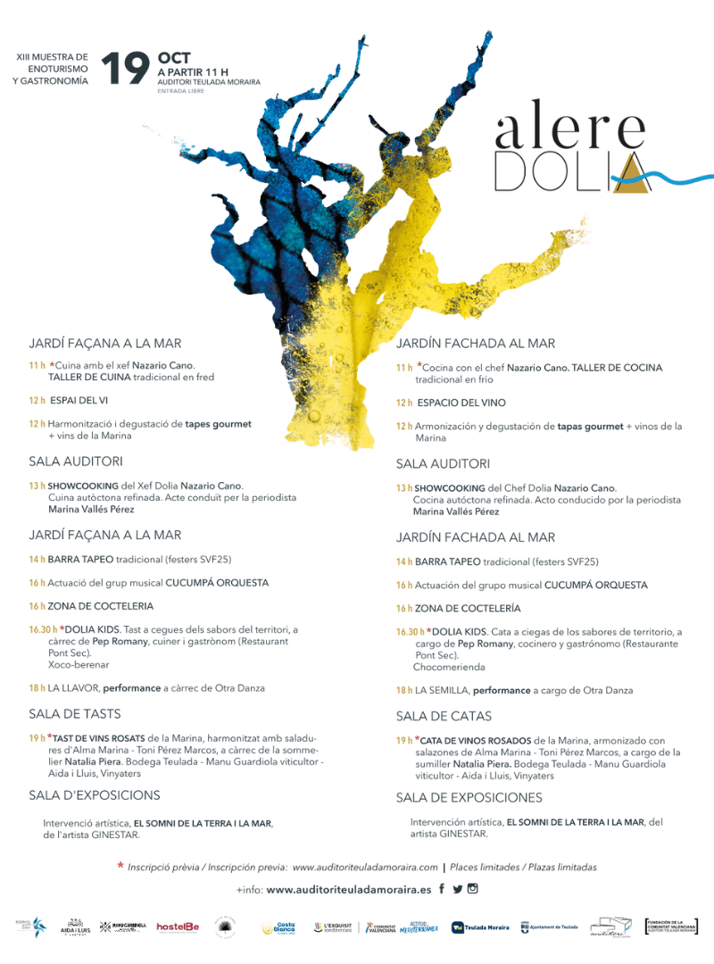 10 de octubre de 2024 - 12:05Una evento esencial para dar luz a los productos locales de Teulada Moraira 1 de 7Foto SiguienteVer el artículo original: Llega la XIII edición de Alere Dolia: una cita imperdible con la tradición culinaria y el enoturismo de Teulada Moraira Programación de la XIII edición de Alere Dolia Acude a la cata a ciegas de los sabores de territorio con Pep Romany Degusta vinos locales en Alere Dolia en Auditori Teulada Moraira Disfruta del taller de cocina de Nazario Cano en la XIII de Alere Dolia Llega la XIII edición de Alere Dolia una cita imperdible con la tradición culinaria y el enoturismo de Teulada Moraira XIII edición de Alere Dolia